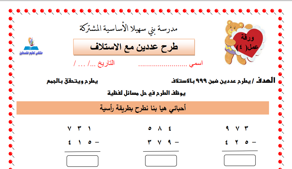 أوراق عمل رائعة جدا لطرح عددين مع استلاف لمبحث الرياضيات ثاني الفصل الثاني