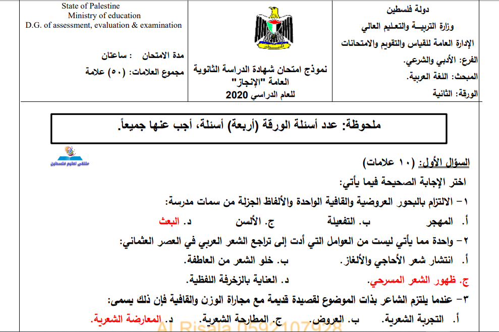 اذهب إلى تحميل نموذج مجاب ورقة أولى 2 ( أدبي وكافة الفروع )
